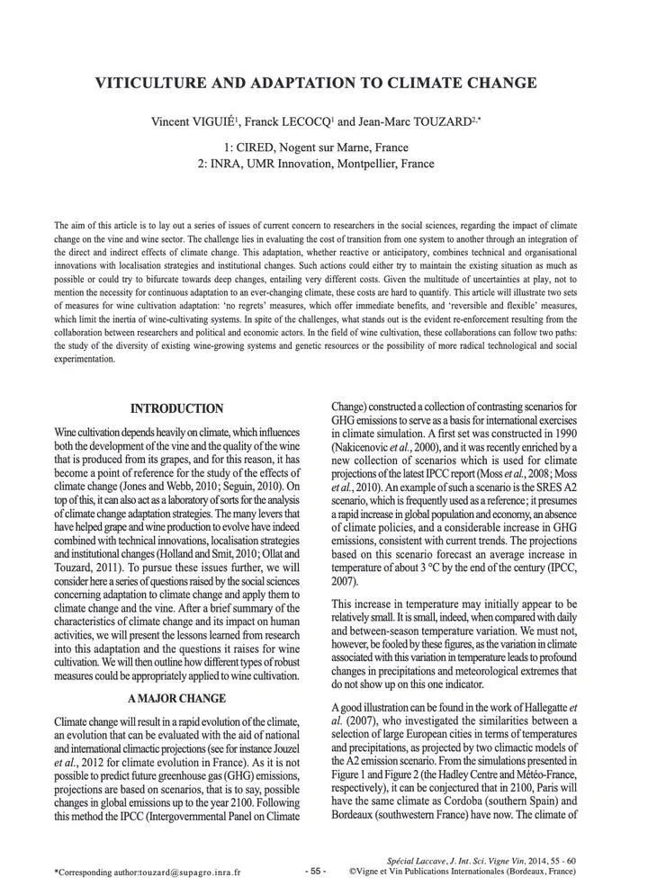 The aim of this article is to lay out a series of issues of current concern to researchers in the social sciences, regarding the impact of climate change on the vine and wine sector. The challenge lies in evaluating the cost of transition from one system to another through an integration of the direct and indirect effects of climate change. This adaptation, whether reactive or anticipatory, combines technical and organisational innovations with localisation strategies and institutional changes. Such actions could either try to maintain the existing situation as much as possible or could try to bifurcate towards deep changes, entailing very different costs. Given the multitude of uncertainties at play, not to mention the necessity for continuous adaptation to an ever-changing climate, these costs are hard to quantify. This article will illustrate two sets of measures for wine cultivation adaptation: ‘no regrets’ measures, which offer immediate benefits, and ‘reversible and flexible’ measures, which limit the inertia of wine-cultivating systems. In spite of the challenges, what stands out is the evident re-enforcement resulting from the collaboration between researchers and political and economic actors. In the field of wine cultivation, these collaborations can follow two paths: the study of the diversity of existing wine-growing systems and genetic resources or the possibility of more radical technological and social experimentation.